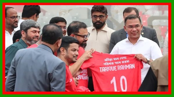 প্রধানমন্ত্রীর হাতে ১০ নম্বর জার্সি তুলে দেন ক্রীড়া প্রতিমন্ত্রী আমিনুল হক