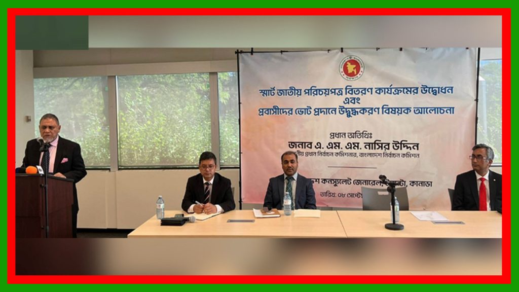 ঢাকা, ১১ সেপ্টেম্বর ২০২৫ইং (ঢাকা টিভি রিপোর্ট): বাংলাদেশ কনস্যুলেট জেনারেল, টরন্টো আয়োজিত ‘স্মার্ট জাতীয় পরিচয়পত্র বিতরণের কার্যক্রমের উদ্বোধন এবং প্রবাসীদের ভোট প্রদানে উদ্বুদ্ধকরণ’ বিষয়ক আলোচনা অনুষ্ঠানে বাংলাদেশি প্রবাসীদের সঙ্গে মতবিনিময়কালে প্রধান নির্বাচন কমিশনার (সিইসি) এ এম এম নাসির উদ্দিন বলেছেন, আগামী জাতীয় সংসদ নির্বাচনে নিবন্ধিত প্রবাসী ভোটার ও জাতীয় পরিচয়পত্রধারী (এনআইডি) বাংলাদেশিরা পোস্টাল ব্যালটের মাধ্যমে তাদের ভোটাধিকার প্রয়োগ করতে পারবেন। এ জন্য ‘পোস্টাল ব্যালট বিডি’ নামে একটি অ্যাপ তৈরির কাজও চলমান রয়েছে বলে জানান তিনি। আজ বৃহস্পতিবার (১১ সেপ্টেম্বর) ঢাকায় প্রাপ্ত এক তথ্যবিবরণীতে এ বিষয় জানানো হয়।