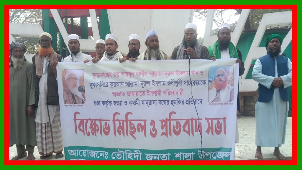 হাবিবুর রহমান হাবিব, শাল্লা উপজেলা (সুনামগঞ্জ), ০১ ফেব্রুয়ারী ২০২৬ইং (ঢাকা টিভি রিপোর্ট): সুনামগঞ্জের শাল্লায় দেশবরেণ্য আলেমেদ্বীন শায়খুল হাদিস আল্লামা নূরুল ইসলাম খান ও বিশিষ্ট মুফাসসিরে কুরআন আল্লামা নূরুল ইসলাম ওলীপুরীকে প্রাণনাশের হুমকি এবং কওমি মাদ্রাসা বন্ধের ষড়যন্ত্রের প্রতিবাদে উত্তাল হয়ে উঠেছে জনপদ। জামায়াতে ইসলামী পরিচয়দানকারী অজ্ঞাত ব্যক্তির এই হুমকির প্রতিবাদে রোববার (১ ফেব্রুয়ারি) দুপুরে শাল্লা সদরে বিশাল বিক্ষোভ মিছিল ও প্রতিবাদ সমাবেশ অনুষ্ঠিত হয়েছে।
