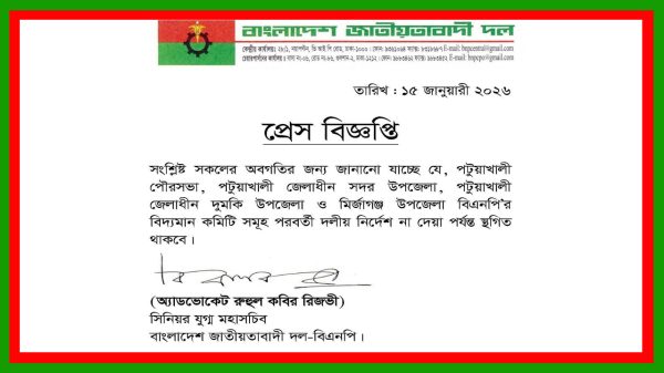 পটুয়াখালী-১ আসনের বিএনপির ৪ ইউনিটের সাংগঠনিক কার্যক্রম স্থগিত